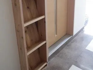 天井はクロス貼り → 板張りに。 部屋に入って右の壁1面に、間接照明+エコカラットで仕上げました。