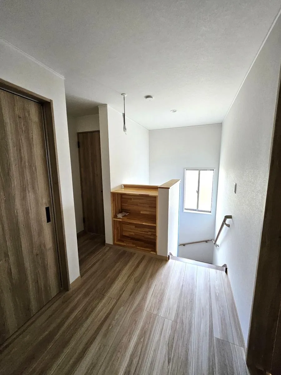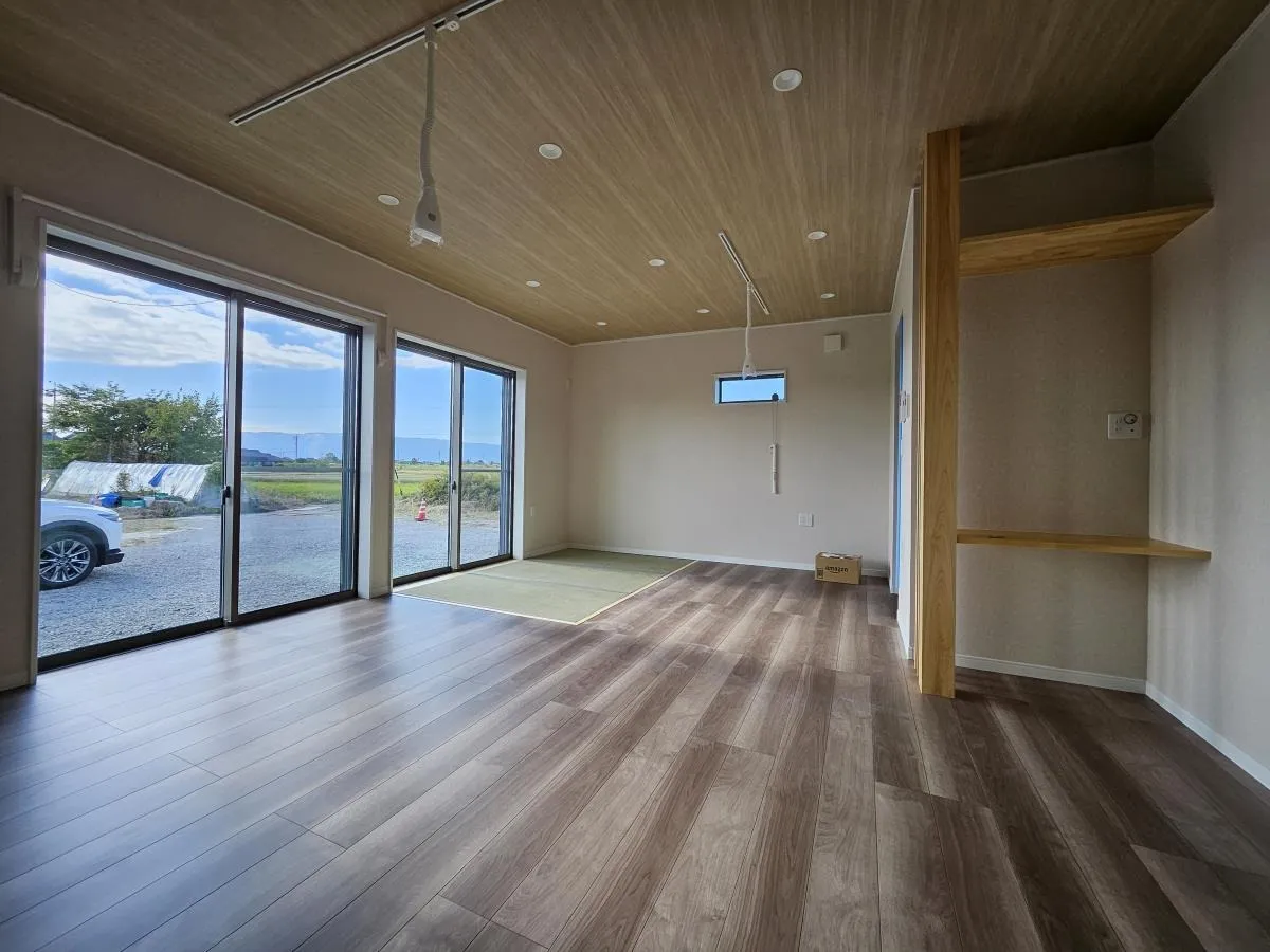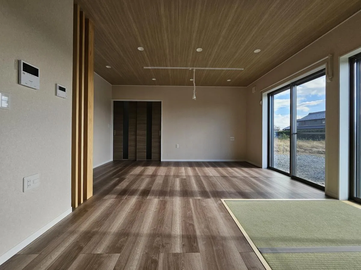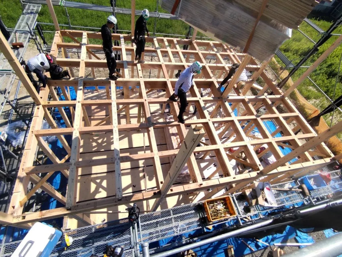 愛知県愛西市 M様邸 LD キッチン 隠れキッチン、プライベート空間として 玄関CL 杉板張り・可動板 LD+畳コーナー(敷き込み畳) ※国産(熊本)イ草使用 2Fホール 収納棚 WIC 木製デッキ(お客様塗装仕上げ) 2024.7.23 M様邸の新築工事上棟です。 最高の天候で猛暑の中、職人さん9人で建築中。