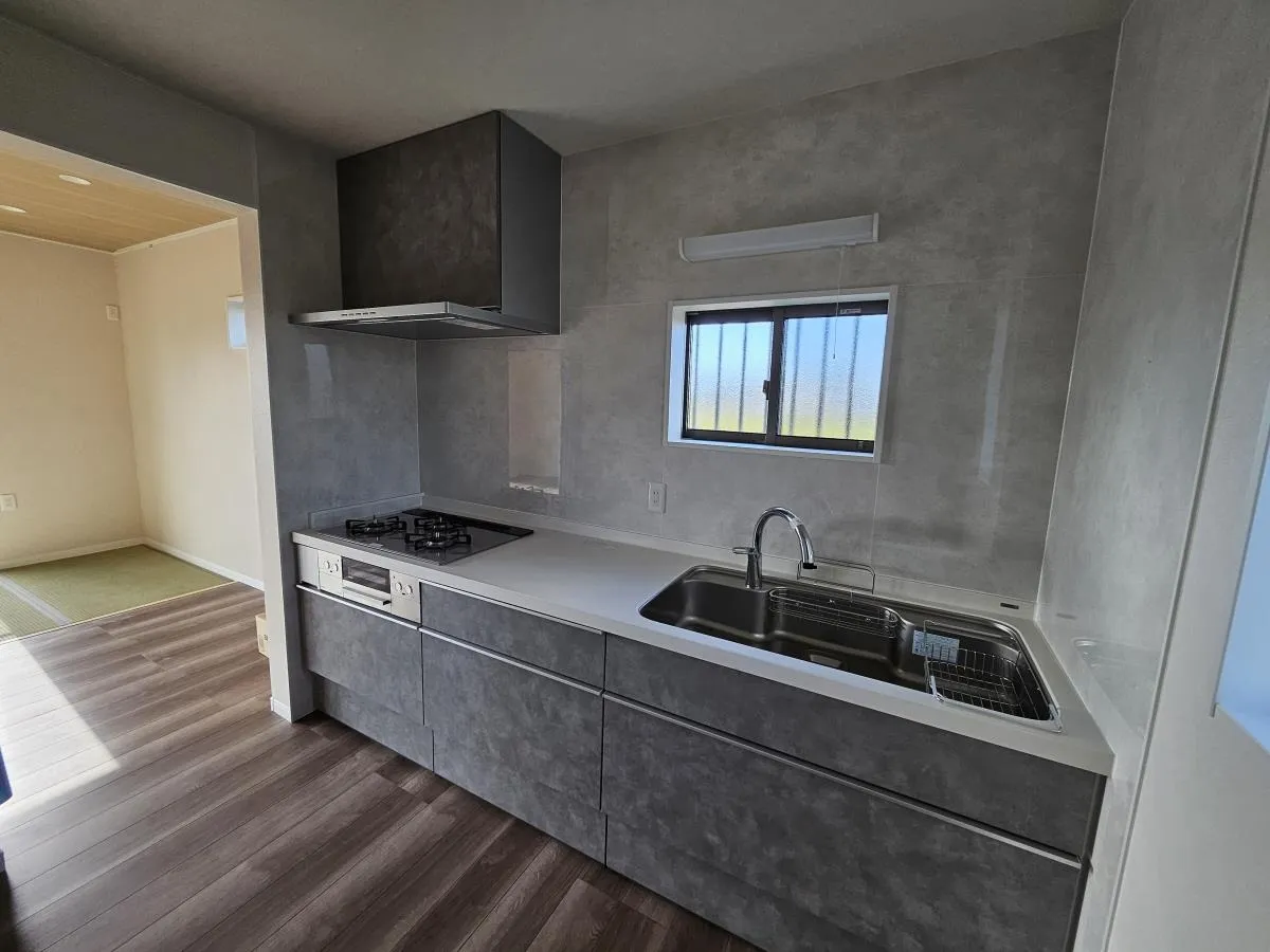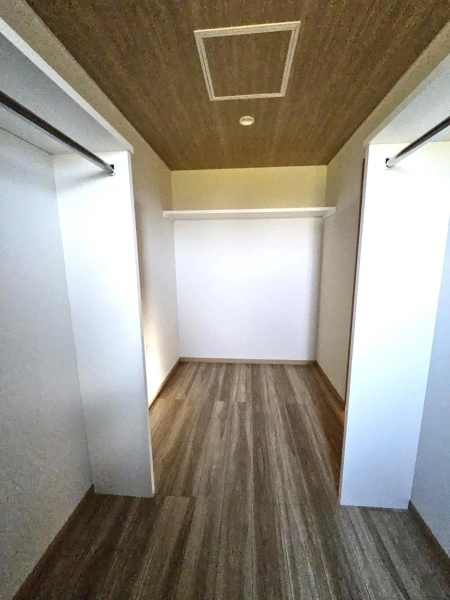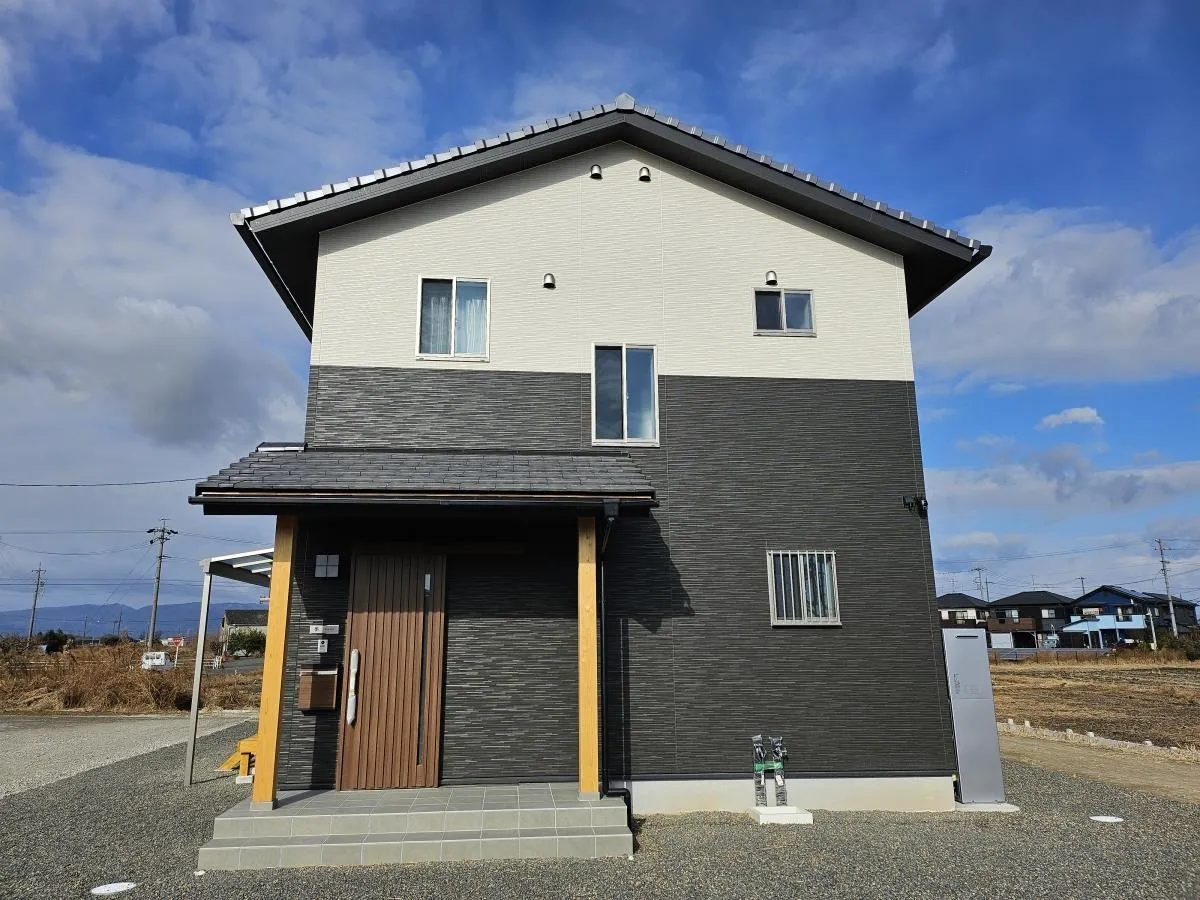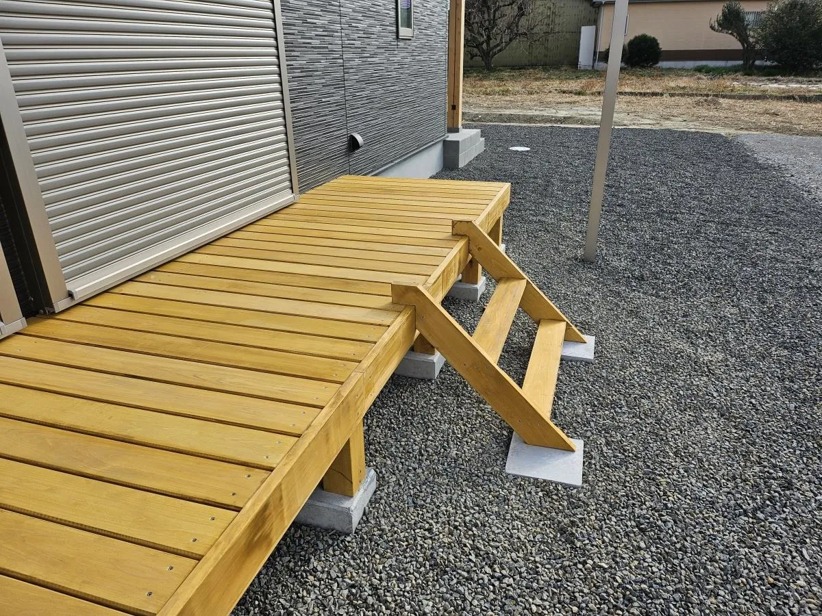 愛知県愛西市 M様邸 LD キッチン 隠れキッチン、プライベート空間として 玄関CL 杉板張り・可動板 LD+畳コーナー(敷き込み畳) ※国産(熊本)イ草使用 2Fホール 収納棚 WIC 木製デッキ(お客様塗装仕上げ) 2024.7.23 M様邸の新築工事上棟です。 最高の天候で猛暑の中、職人さん9人で建築中。